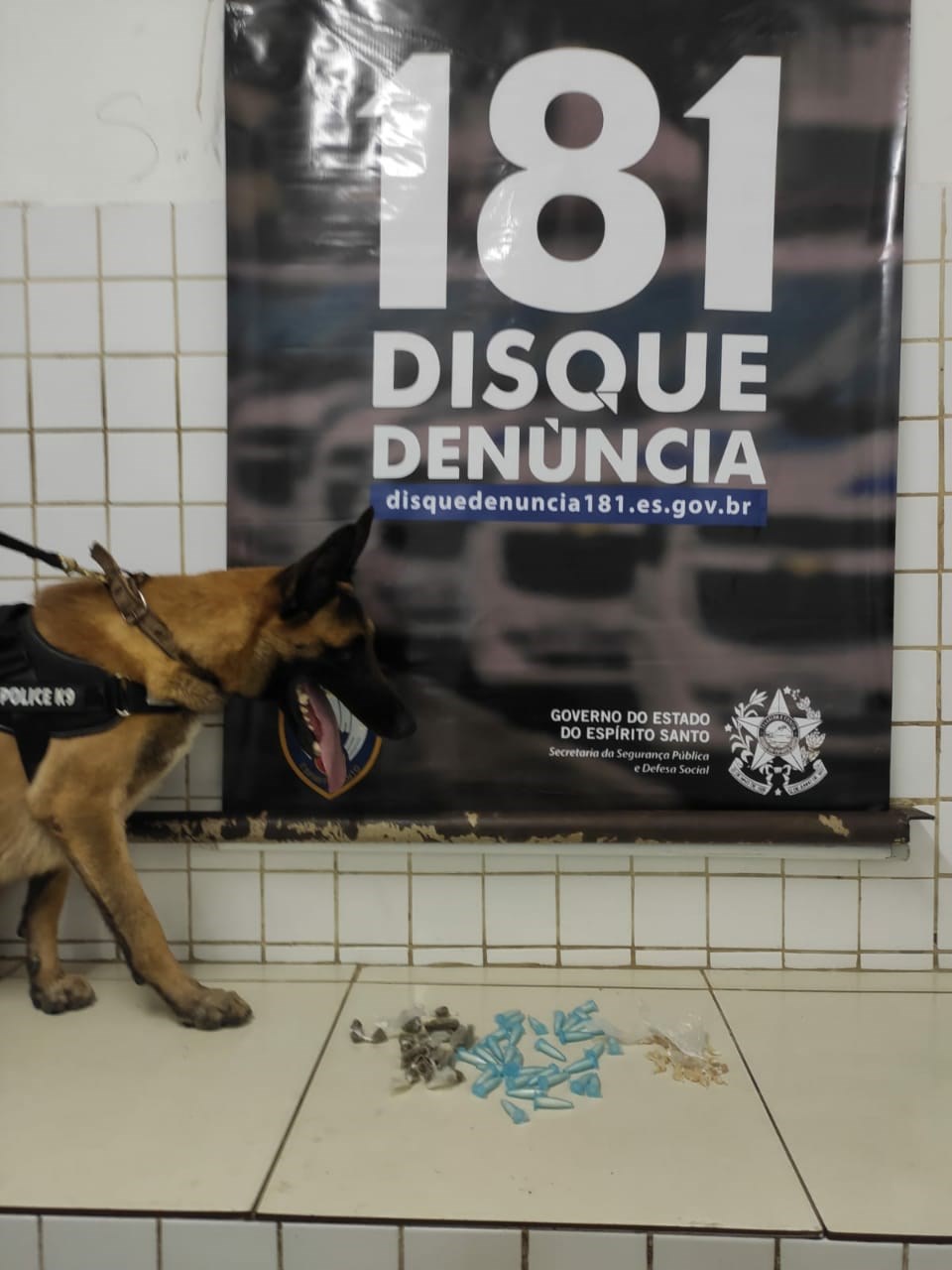 Durante patrulhamento a fim de verificar denúncias sobre tráfico de drogas, uma guarnição da Polícia Militar e do K9, juntamente com o serviço reservado (P2) do sexto batalhão (Serra), prosseguiu até a travessa carioca no bairro Rosário de Fátima. No local foi realizado o emprego do cão Apollo que logrou êxito em encontrar a quantidade de 33 pinos de cocaína, 32 pedras de crack e 20 buchas de maconha.