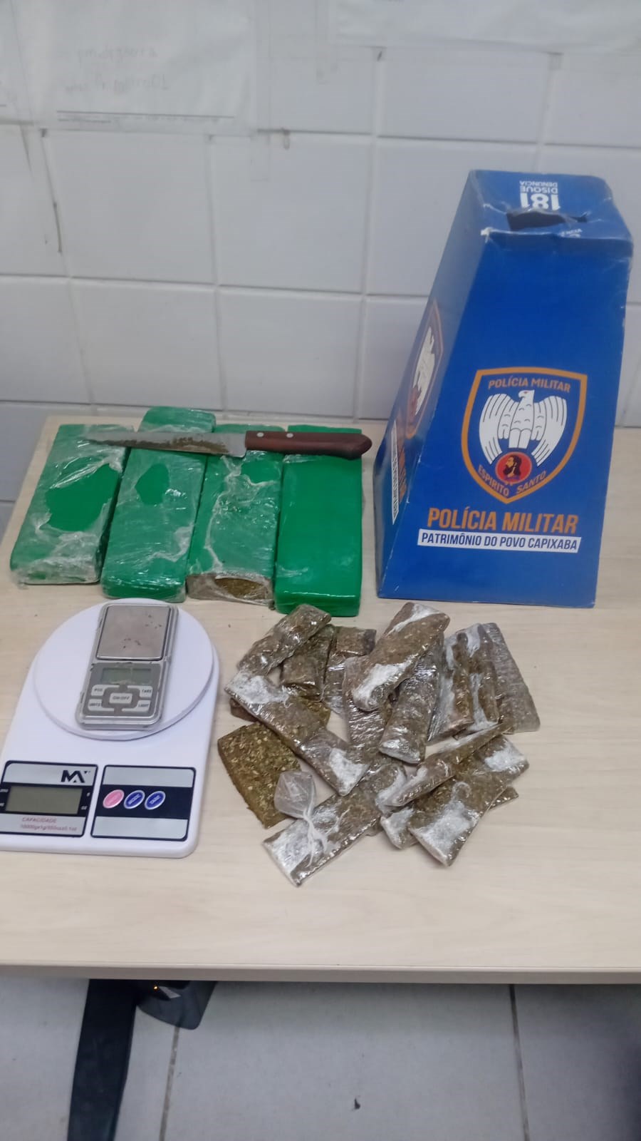 Ao todo, foram arrecadados quatro tabletes de maconha e 18 porções menores da mesma substância, totalizando aproximadamente 2,3 quilos, além de duas balanças de precisão e uma faca utilizada para o manuseio e fracionamento da droga. Todo o material foi devidamente acondicionado em envelopes de segurança.