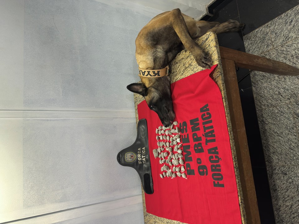 No local indicado, não foram visualizadas pessoas em atitude suspeita. Diante da denúncia, foi empregado o cão farejador da unidade K9, que logrou êxito em localizar uma sacola contendo 63 buchas de substância análoga à maconha, escondida no terreno.
