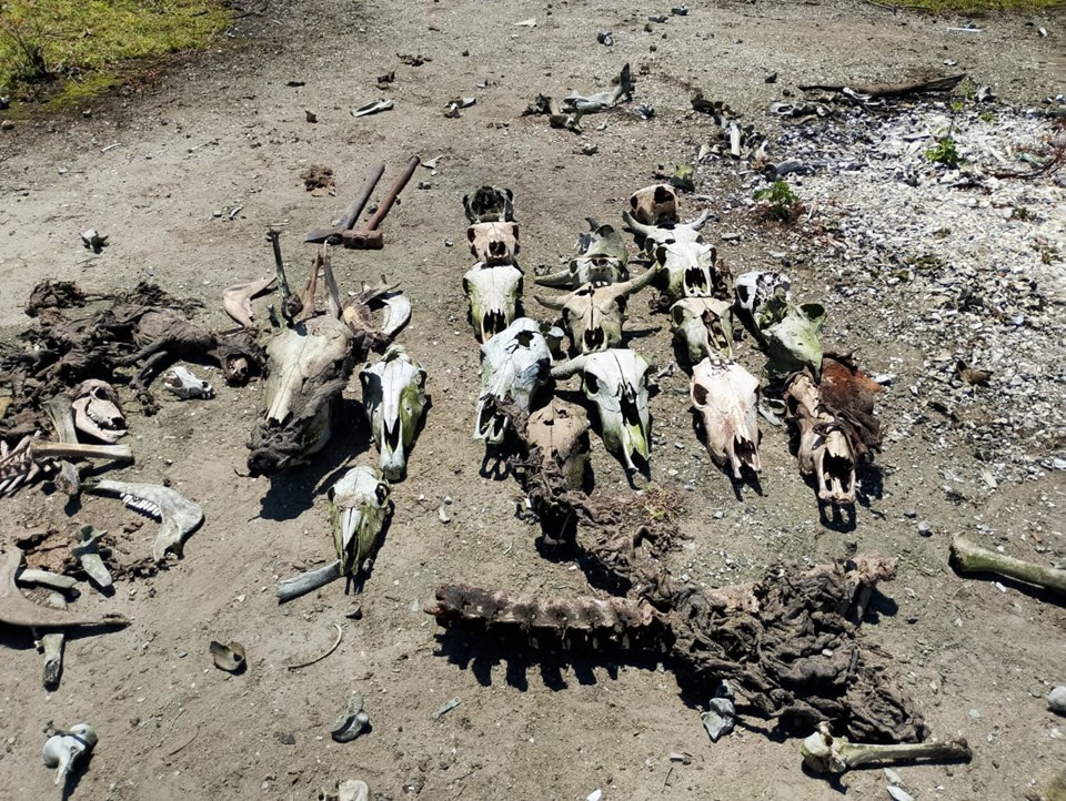 No local, foram encontrados restos mortais de animais, incluindo bovinos, eqüinos e cães, totalizando dezenas de carcaças e crânios em diferentes estágios de decomposição. Instrumentos utilizados para abate, como machados, marretas e equipamentos improvisados, também foram identificados, além de indícios recentes de atividade de abate.