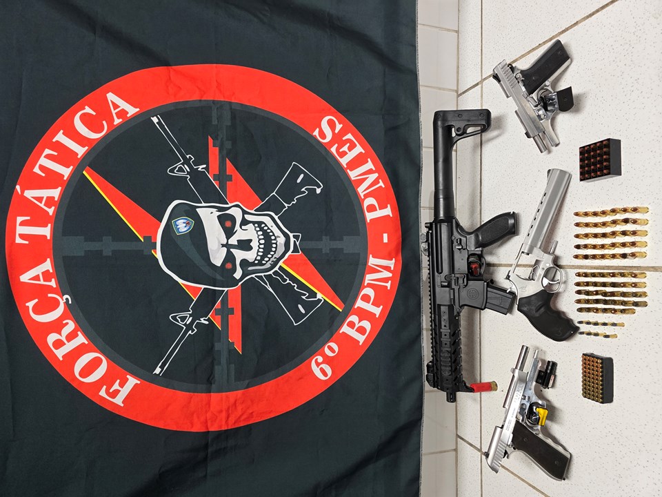Durante a ação, os militares abordaram um imóvel na Rua Valdir Drasto Donadia, local indicado em várias denúncias anônimas. No local, foram encontradas três armas de fogo — uma pistola calibre 9mm, uma pistola calibre .380 e um revólver calibre .22 — além de munições e uma réplica de fuzil utilizada em práticas criminosas.