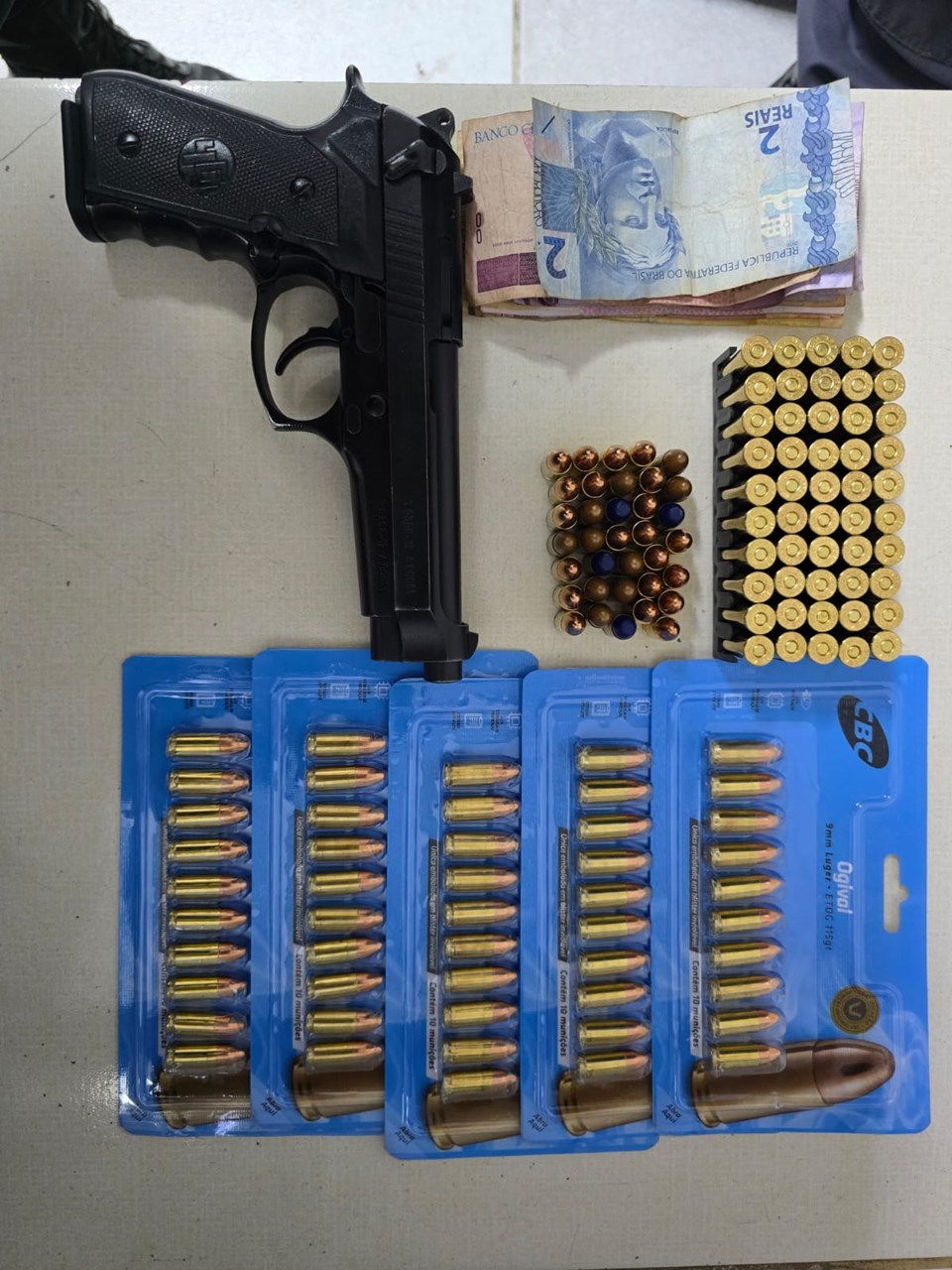 Durante as diligências, um dos suspeitos foi alcançado no interior de uma residência. Com o apoio de cão farejador especializado na detecção de armas e entorpecentes, foram realizadas buscas no imóvel, sendo localizada uma pistola calibre 9mm, carregada com munições, além de outras munições de diferentes calibres e dinheiro em espécie.