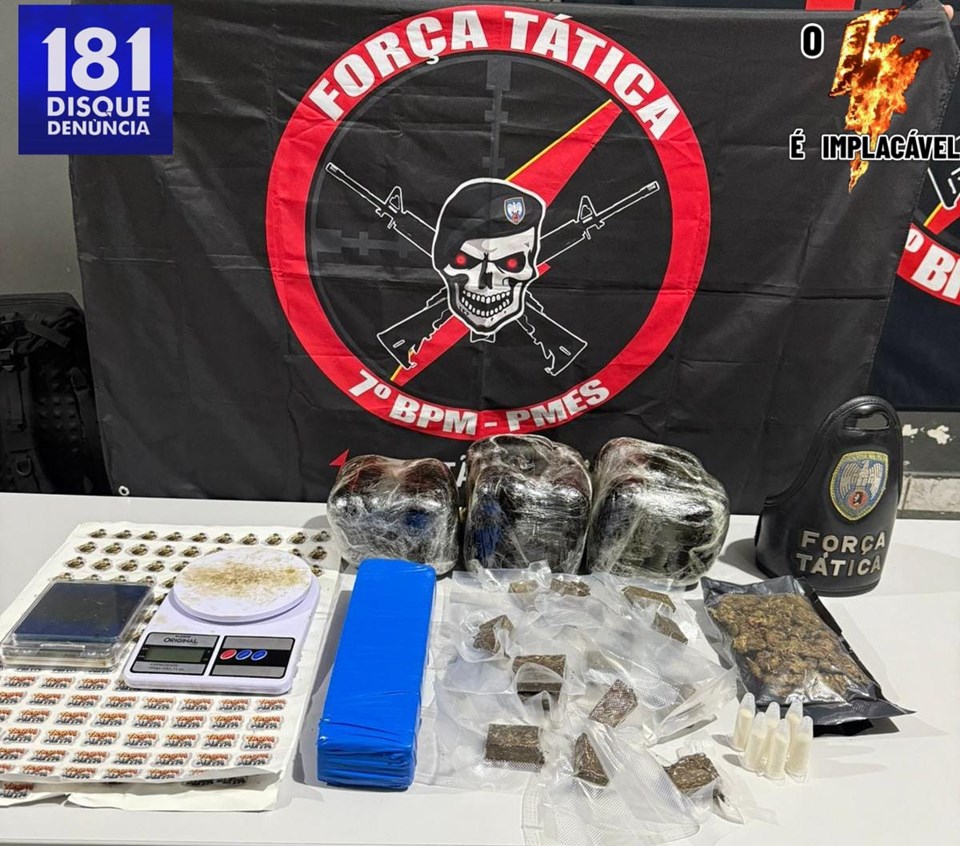 Durante a verificação, foram localizados diversos materiais ilícitos, incluindo aproximadamente 8 kg de substância análoga ao haxixe, além de porções de maconha, cocaína, skank, balanças de precisão e materiais utilizados para embalo e comercialização de drogas.