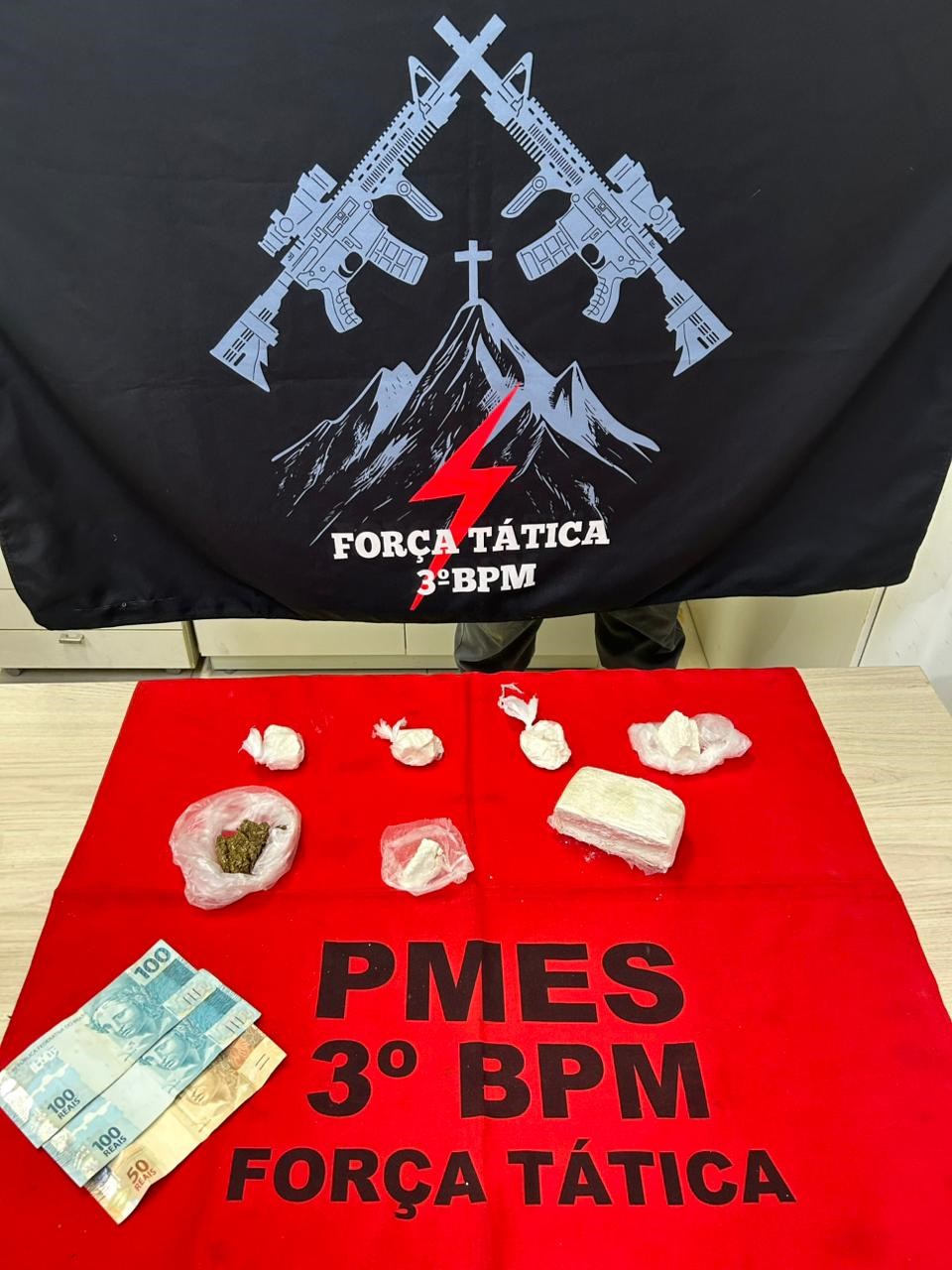 Durante a revista, foi encontrada com o suspeito uma porção de substância semelhante à cocaína. No interior do terreno, os policiais localizaram a sacola dispensada, contendo aproximadamente 379 gramas de material análogo à cocaína, além de uma porção de maconha pronta para a comercialização. Segundo a PM, a quantidade apreendida poderia render cerca de 392 porções individuais.