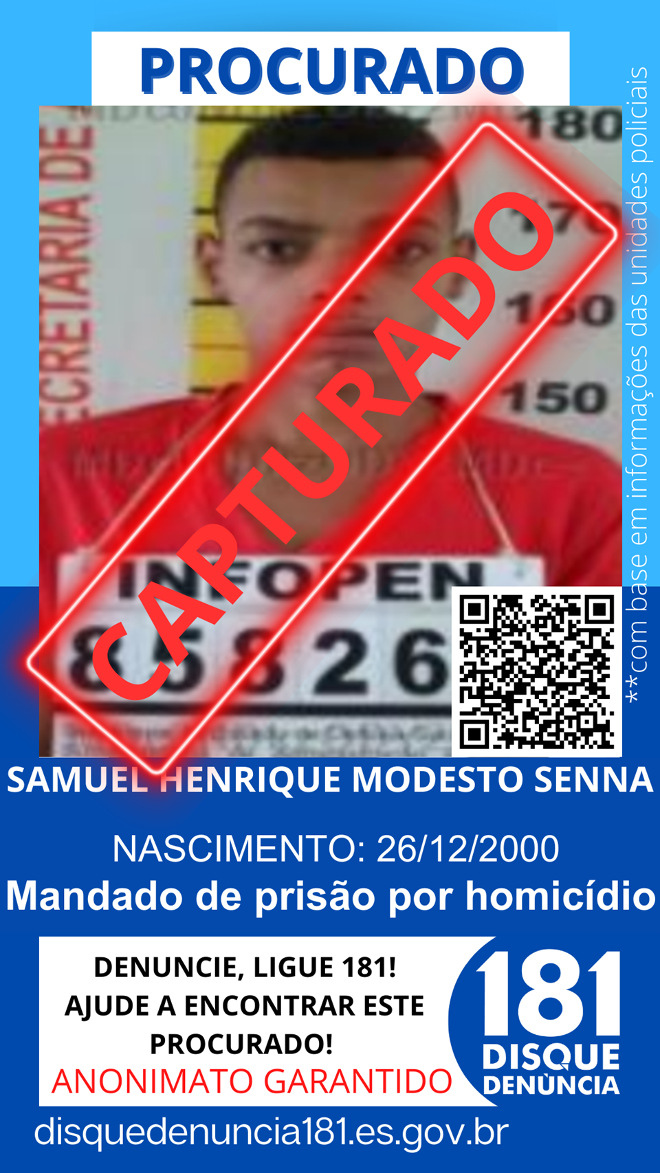Após consulta nominal no sistema do Conselho Nacional de Justiça (CNJ), foi constatado que havia mandado de prisão em aberto pelo crime de homicídio em desfavor de Samuel Henrique Modesto Senna.