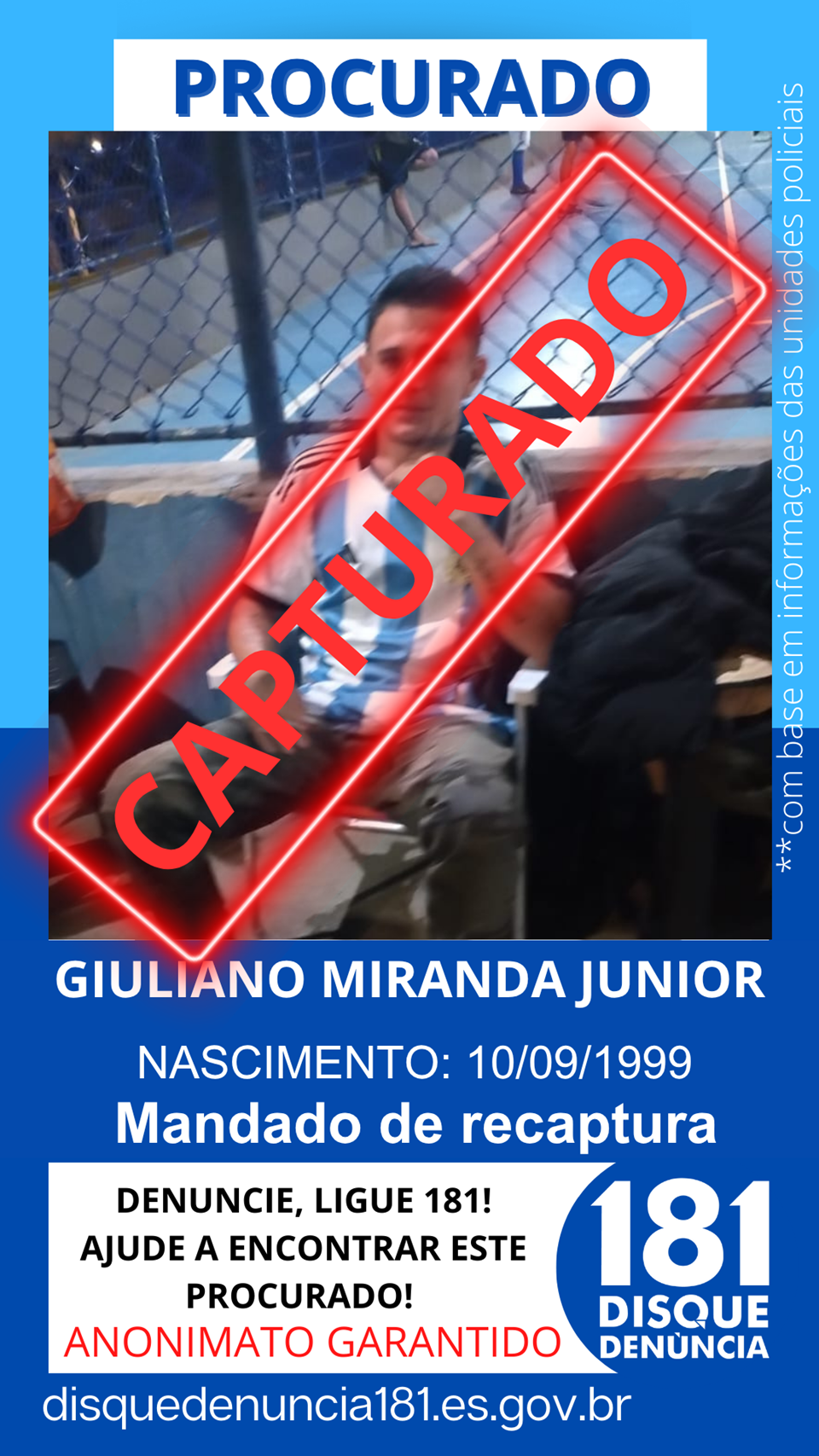 A prisão foi possível graças a informações repassadas pelo disque-denúncia 181. No local indicado,  bairro Bandeirantes, na praça do bairro — os militares confirmaram que o suspeito tratava-se de Giuliano Miranda Júnior, 26 anos, que se encontrava foragido do sistema prisional. Contra ele havia um mandado de recaptura, expedido pela 2ª Vara Criminal de Viana – TJES.