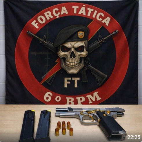 No local, foi apreendida uma pistola calibre 9mm, carregada com munições intactas e um carregador sobressalente. O suspeito recebeu voz de prisão e foi conduzido à autoridade policial, juntamente com o material apreendido. Foi necessário o uso de algemas para garantir a segurança dos policiais e evitar risco de fuga.