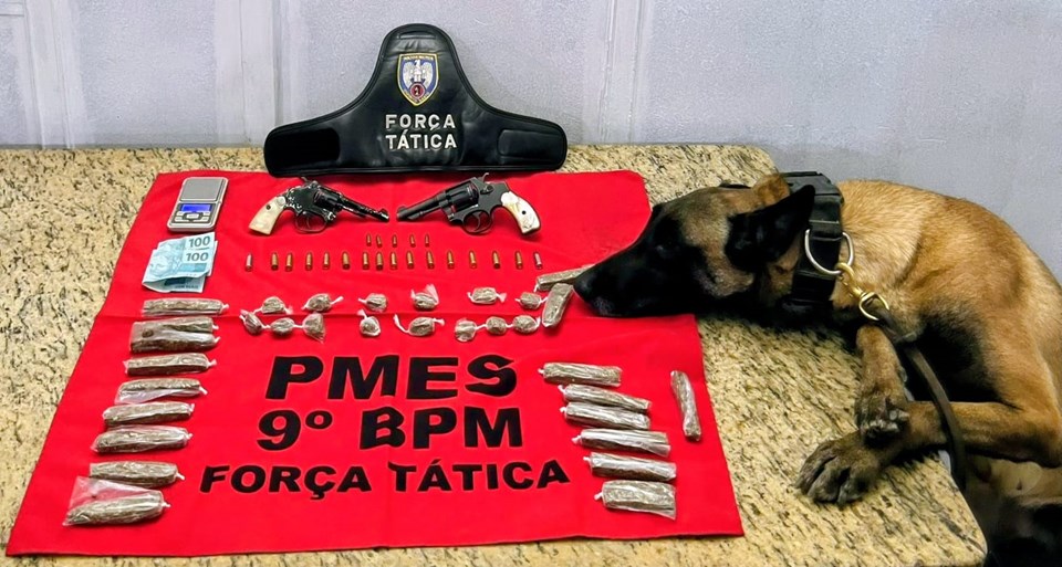 Com o apoio do cão policial Kiara, os militares realizaram buscas no imóvel do abordado e localizaram duas armas de fogo — um revólver calibre .32 e um revólver calibre .22, ambos municiados — além de munições adicionais, 18 tiras e 14 buchas de maconha, e uma balança de precisão.