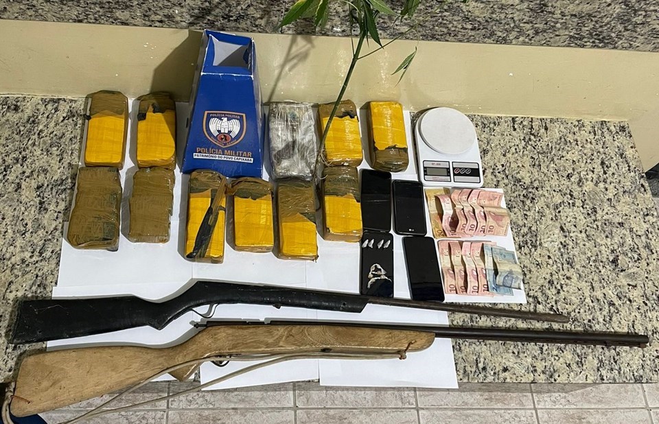 Nesse momento, os policiais lograram êxito ao apreender 5kg de maconha, 1kg de crack, seis pedras de crack, quatro pinos de cocaína, um pé de maconha, duas espingardas, uma balança de precisão, dinheiro e quatro celulares.