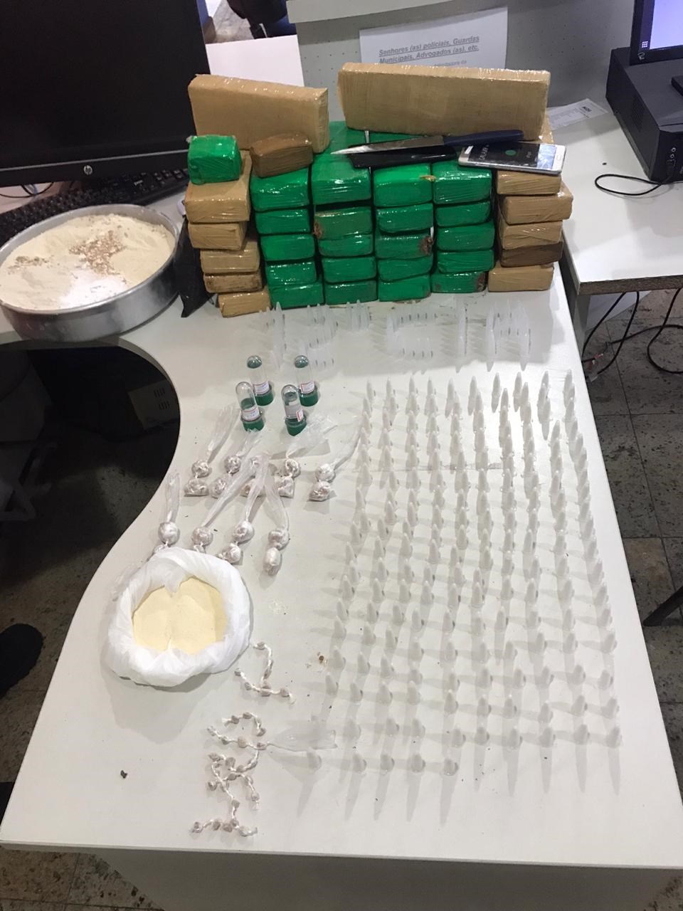 Policiais Militares da 12ª Cia Independente (Vitória), após receberem denúncias anônimas sobre tráfico de drogas na região de Goiabeiras, prosseguiram até a rua Antônio Carlos de Almeida, onde avistaram dois indivíduos conhecidos por serem usuários de drogas de frente a uma residência, e que ao avistarem os militares fugiram imediatamente. No entanto, no portão da referida casa, os militares encontraram o proprietário, o Sr. O. J. A. , 56 anos, que indagado sobre os suspeitos, informou que um deles era seu sobrinho e que estaria na residência, e que acompanhando os militares averiguarem o local em que seu sobrinho A. C., 25 anos dormia, foram encontrados ao lado da cama, além de embalagens de drogas já consumidas, 31 tabletes de maconha de aproximadamente 20cm; 01 tablete de maconha de aproximadamente 30cm; 02 pedaços de maconha de aproximadamente 5cm; 04 frascos de substancia similar a adrenalina; 01 sacola branca com aproximadamente 120g de cocaína; 01 invólucro preto de aproximadamente 650g de lidocaína (in natura); 01 forma de bolo grande de cocaína de aproximadamente 3,70kg; 272 unidades de crack,  176 pinos de cocaína; Material para embalo, tais como pinos, borrachas e uma faca; 01 balança de precisão;  02 celulares. O total pesado das drogas apreendidas foi de 23kg de maconha, 04kg de pasta base de cocaína, 284 pedras de crack e 185 pinos de cocaína. A.C. recebeu voz de prisão, sendo encaminhado juntamente com o material à 1ª Delegacia Regional em Vitória.