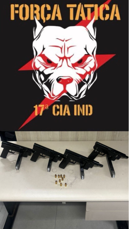 Durante incursão a pé por becos e vielas no bairro Primeiro de Maio, numa região conhecida como “QG”, os militares da Força Tática realizaram buscas em um terreno baldio quando conseguiram localizar em meio a vegetação, 02 submetralhadoras semi industriais calibre .380 e municiadas.