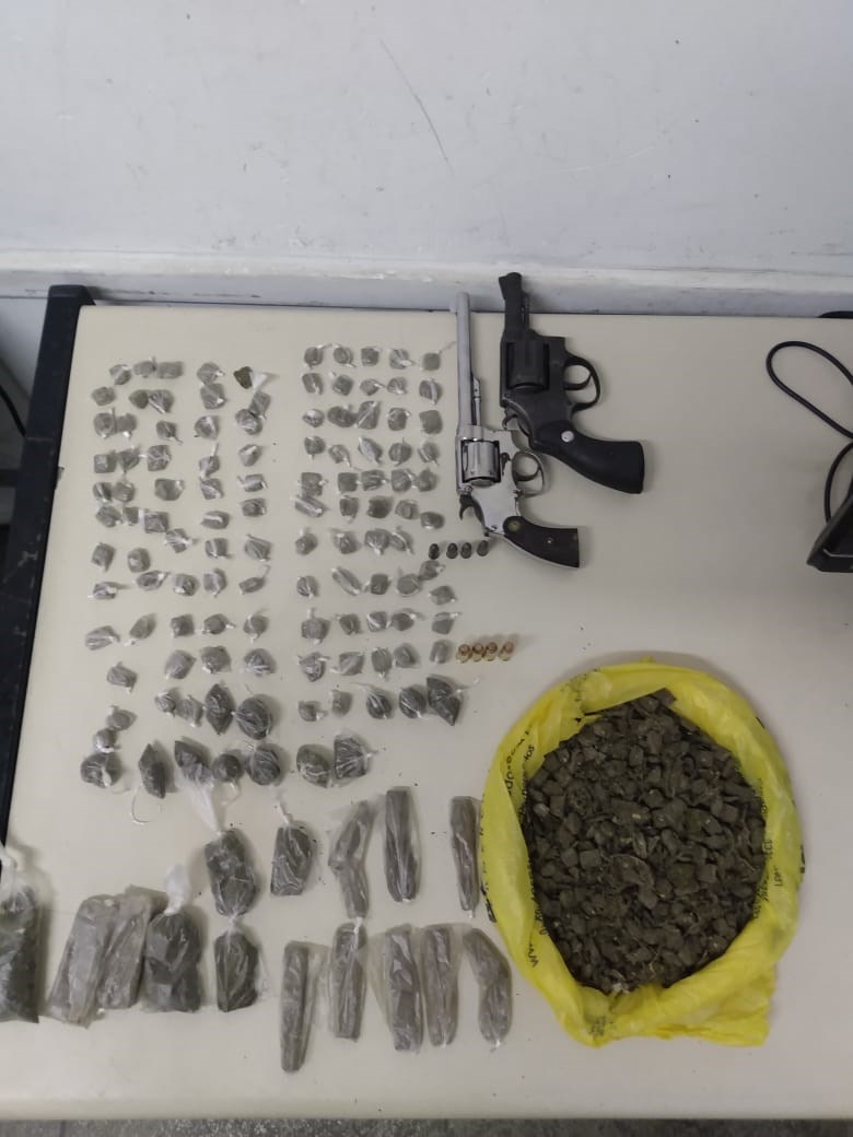 Diante dos fatos a guarnição prosseguiu ao local, e em frente ao bar indicado na denúncia, localizou um rapaz com as mesmas características relatadas, que após a busca pessoal, foi identificado como B.R.S - 20 anos, e com ele, dentro do bolso da bermuda, foram encontradas 15 buchas de maconha. A mãe do rapaz se apresentou aos policiais, e diante dos fatos autorizou a entrada da equipe policial em sua residência para realizar buscas no quarto do seu filho. Foram encontrados então, uma mochila preta contendo 132 buchas de maconha, 01 sacola amarela contendo uma grande quantidade de maconha, e embaixo do colchão foram encontrados 01 revolver cal.38 com numeração raspada, municiado com 03 munições intactas e 01 picotada, e 01 revolver geco alongado cal.32, n°10745, municiado com 04 munições picotadas.