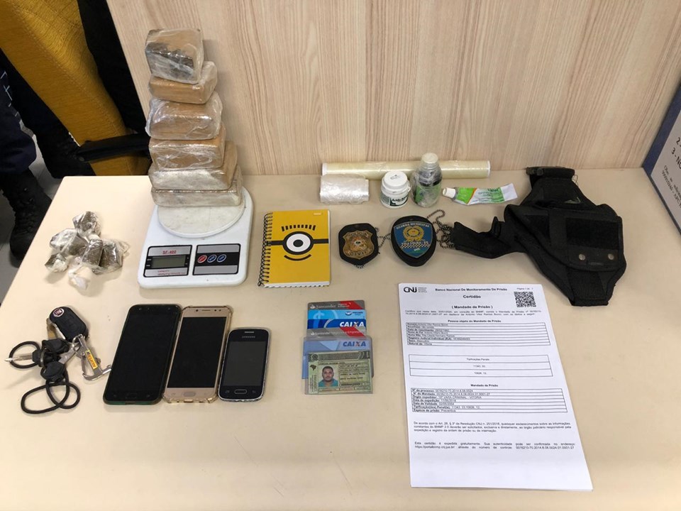 Na residência foram localizados material para embalo de entorpecentes, aproximadamente 1,6kg de maconha, documentos falsos, caderno com contabilidade do tráfico, coldre para arma de fogo, balança de precisão, além da prisão de J.V.O.D. que era responsável por armazenar e distribuir o material.