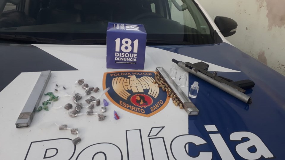 No final de tarde do dia 30/05/2022, Policiais militares da Força Tática em apoio ao Serviço de Inteligência do 6ºBPM, prosseguiram ao bairro Jardim Carapina, Serra/ES, para verificar uma denúncia anônima recebida através do 181, e apreenderam no local uma Metralhadora de fabricação caseira calibre 380, com 02 carregadores e 19 munições Cal. 380; 07 pedras de crack; 21 buchas de maconha; 02 pinos de cocaína; 03 frascos de loló e 03 unidades de haxixe. Ninguém foi preso, e os materiais apreendidos foram entregues na 3ª Delegacia Regional de Serra.