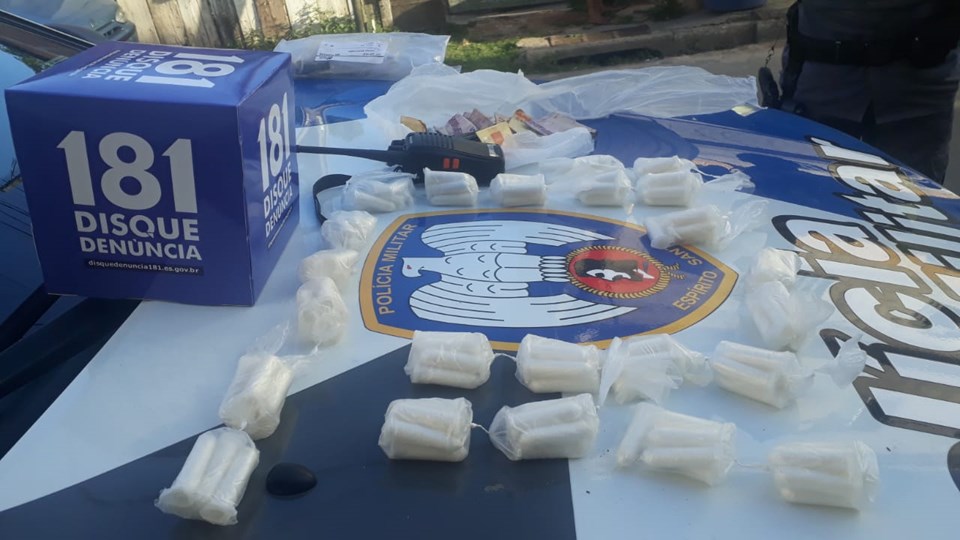 No local, um suspeito com as características do denunciado conseguiu fugir, mas os militares encontraram e apreenderam uma sacola contendo 138 pinos de cocaína, R$ 351,00 em espécie, 01 bucha de maconha e 01 rádio comunicador