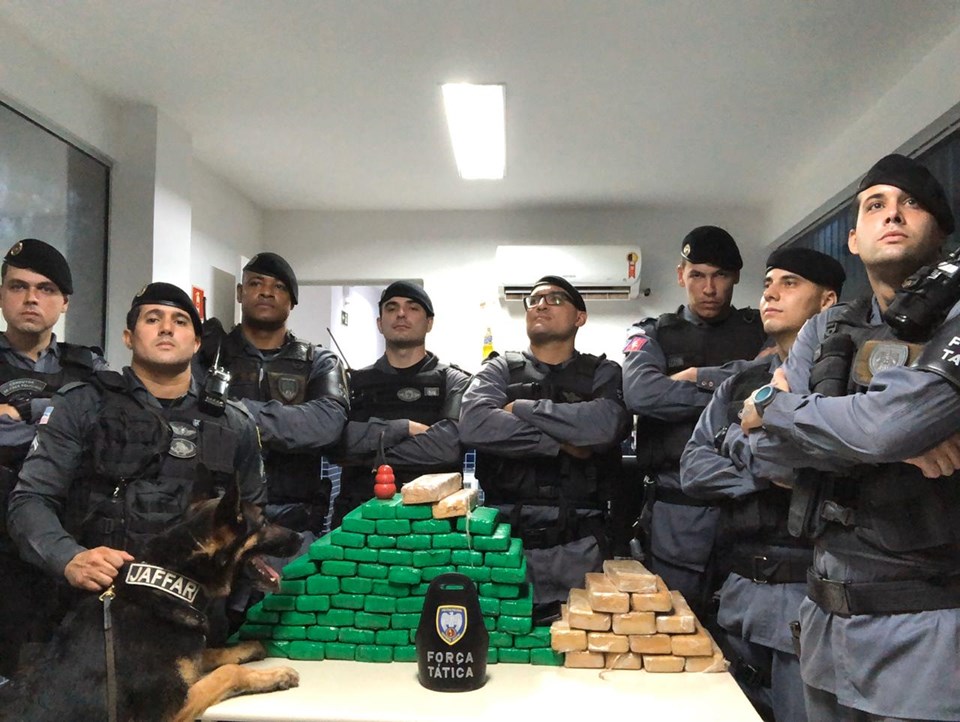 No início da noite de ontem (02/04), durante patrulhamento tático motorizado, equipes da Força Tática da 13ª companhia independente – Terra Vermelha, precisamente na rua São Paulo, bairro Normília da cunha, local conhecido pelo intenso tráfico de drogas, avistaram dois indivíduos aparentando portar armas de fogo, que com a aproximação policial correram pelas ruas do bairro, não sendo possível abordá-los. Foi solicitada a presença da equipe de faro de entorpecentes da 13ª cia independente (k9), que com a ajuda do cão de faro de drogas, jaffar, foi possível localizar a residência em que os dois indivíduos que empreenderam fuga estavam. Após permissão da proprietária para averiguar, os militares, utilizando-se do cão jaffar adentraram o quintal, onde num pequeno cômodo nos fundos da casa principal, sob a cama, o cão encontrou dois fardos contendo maconha. A proprietária acompanhou as buscas, e informou ser seu filho, D.R.P. quem residiria no local. No total foram encontrados 82 tabletes de maconha, pesando aproximadamente 50 quilos. Os suspeitos que fugiram não foram encontrados.
